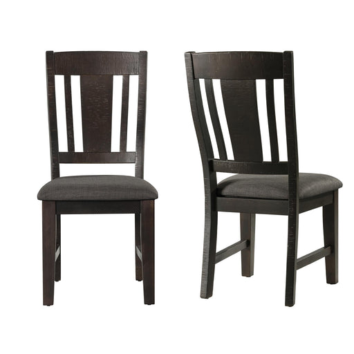 The Finn Wooden Side Chair Set is dressed in a distressed dark walnut finish and features a unique chair back to match the trestles of the table. -...