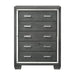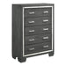 The Titanium 5-Drawer Chest is the perfect addition to your home! This bedroom chest offers plenty of storage space, with its five spacious drawers. The top drawer is felt-lined, protecting your more valuable items, while the bottom drawer features a dust proofing layer to help keep your belongings in tact. On the front of the chest, a mirror glass trim frames the chest; adding extra flair to this already stylish piece. The sleek, chrome handles pair perfectly with the trendy, gray finish. Bracket feet complete the look of this bedroom staple. - Five Spacious Drawers - Felt-Lined Top Drawer - Mirror Trim - Sleek, Chrome Handles - Bracket Feet - Dust Proofing Layer on Bottom Drawer - Anti-Tipping - Trendy Gray Finish Solid Wood/Plywood Wood Species: Rubberwood MDF w/ Mindy Veneer 18 D x 37 W x 53 H, 129lbs. 1 Year Limited Manufacturer Warranty
