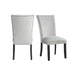 The Francesca Gray Velvet Side Chair Set instantly updates your dining room! This duo is upholstered in a show stopping gray velvet, which will elevate your dining room to the next level. Chrome nail head trim outlines the edges of these chairs, adding extra flair to this already stunning set. The gray velvet pairs beautifully with the sleek, black finish on the legs. Add these chairs to your home today for a look that will never go out of style! - Includes: Two Chairs - Gray, Velvet Fabric - Chrome, Nail Head Trim - Chic, Black Finish on Legs - Transitional Style - Standard Height Rubberwood Foam 28 D x 20 W x 41 H, 30lbs. 1 Year Limited Manufacturer Warranty